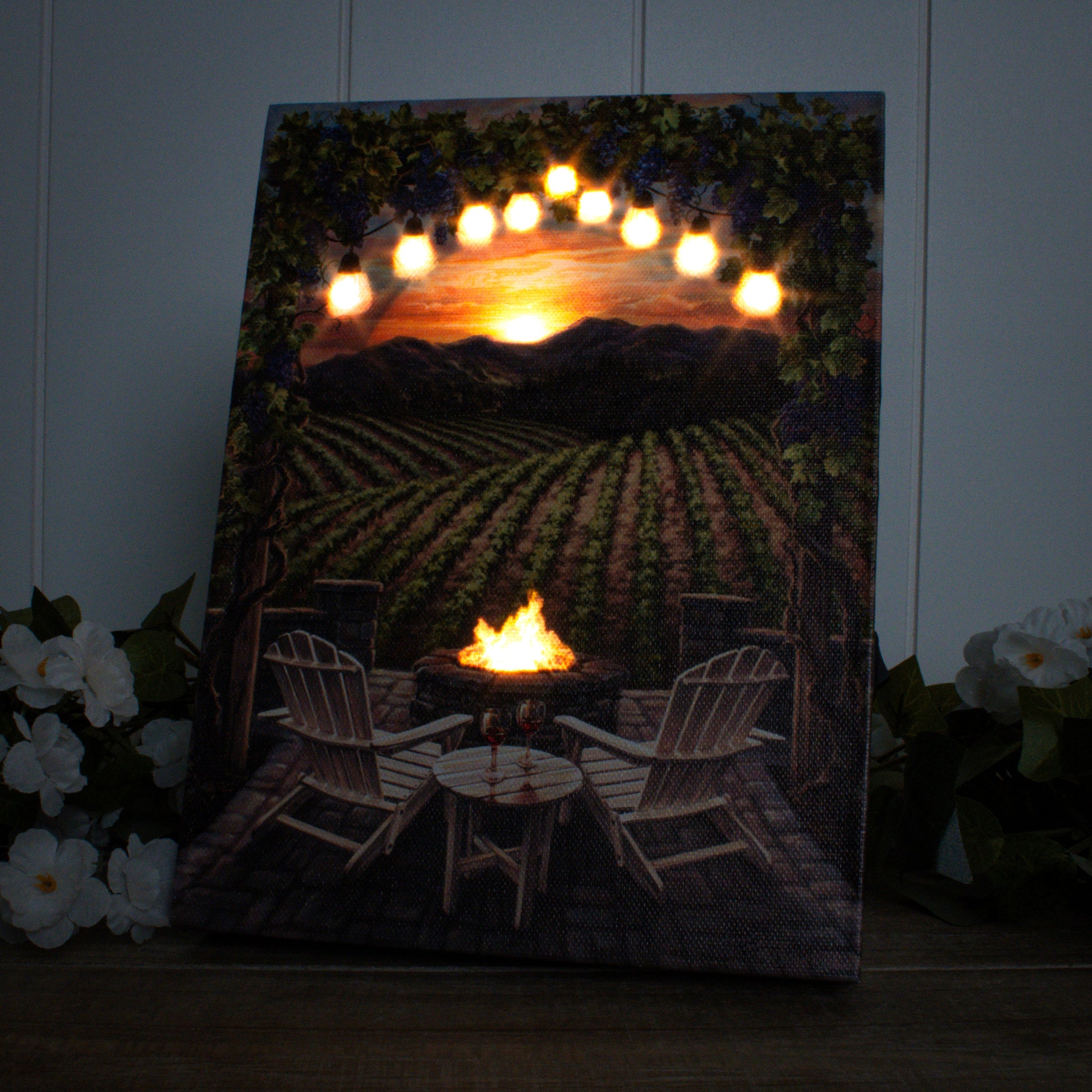 Escape to your own wine country with this charming Glow Decor mini print. Picture yourself in a picturesque vineyard at golden hour—white Adirondack chairs, a crackling fire pit, and glasses of wine glowing under twinkling outdoor lights. This delightful scene brings that cozy, romantic ambiance right into your space. Powered by just 3 AAA batteries, it's the perfect touch for wine enthusiasts who want to celebrate the good life. Cheers to décor that captures the magic of sunset sipping!